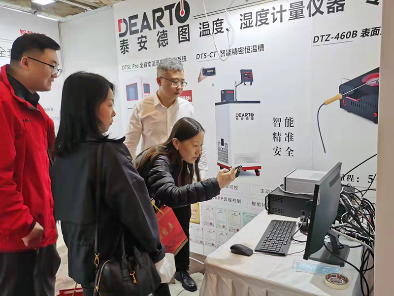泰安德圖會議展示現場此次盛會,泰安德圖展示多款產品的性能特點:DTSL Pro 全自動溫濕度計檢定系統,全自動完成整個檢定行程,無需人工值守、支持自動進行多點溫度、濕度控制,自動進行溫濕度計定位及拍照識別、自動識別數顯式、指針式等不同類型溫濕度表、自動計算檢定結果并判斷檢定結論,實現設備的智能控制;DTS-CT300智能恒溫油槽主動排煙裝置,營造健康無煙實驗室環境;DTS-B系列超便攜智能恒溫槽寬量程(-40~180℃)檢測;DTZ-460B表面溫度計校準系統寬溫度范圍(50~600℃)測量;DTZ-300BW 無線智能溫濕度巡檢儀24通道獨立配置、獨立同步采集。中國計量科學研究院段宇寧老師及在場專家,都對產品表現出濃厚興趣,并對產品的智能化和實用性給予了高度評價與關注。